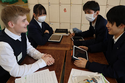 11月21日(木)7時間目、6年生英語コミュニケーションⅢの授業に、ターストラップ生全員が参加しました。なぎさ生は、あらかじめ質問を考えていたようですが、さすが6年生です、途切れることなくコミュニケーションを楽しんでいました。